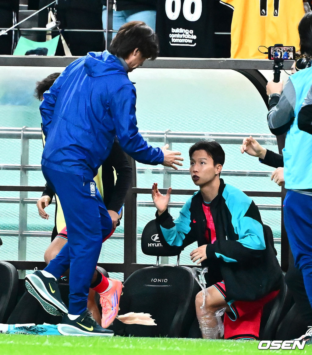 경기를 마치고 한국 홍명보 감독이 엄지성과 승리를 기뻐하고 있다. 2025.10.14. /jpnews@osen.co.kr