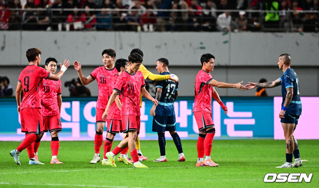 경기를 마치고 한국 선수들이 파라과이 선수들과 인사를 나누고 있다. 2025.10.14. /jpnews@osen.co.kr