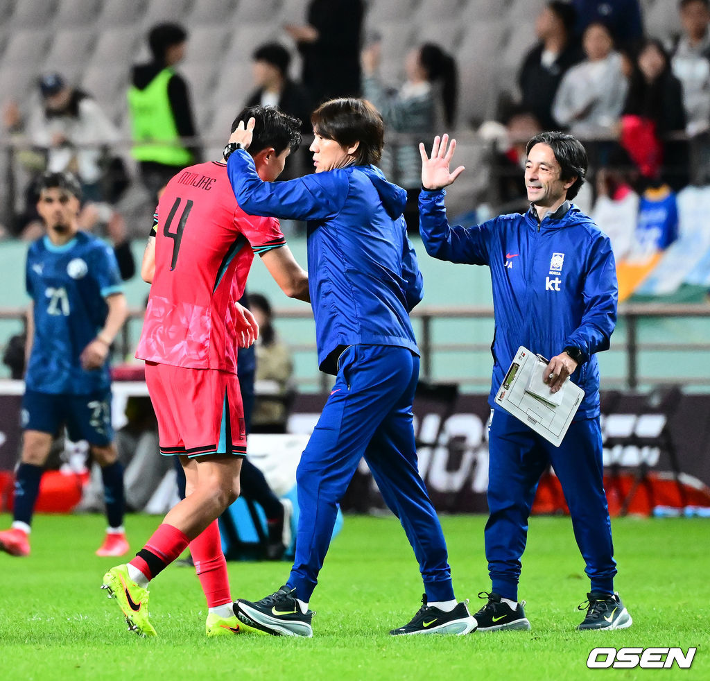 경기를 마치고 한국 홍명보 감독이 김민재와 승리를 기뻐하고 있다. 2025.10.14. /jpnews@osen.co.kr
