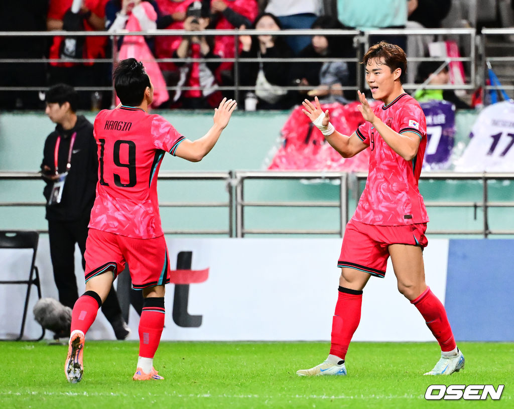후반 한국 오현규가 골을 성공시키며 이강인과 기뻐하고 있다. 2025.10.14. /jpnews@osen.co.kr