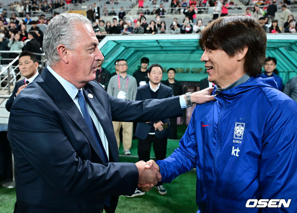 경기 전 파라과이 구스타보 알파로 감독과 대한민국 홍명보 감독이 인사를 나누고 있다. 2025.10.14 /cej@osen.co.kr