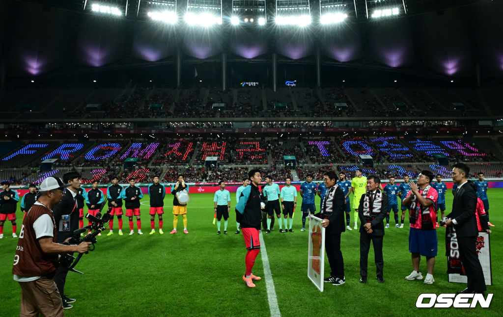 경기 전 차범근 전 감독이 경기장을 찾아 손흥민에게 기념 유니폼을 직접 전달하고 있다. 2025.10.14 /cej@osen.co.kr