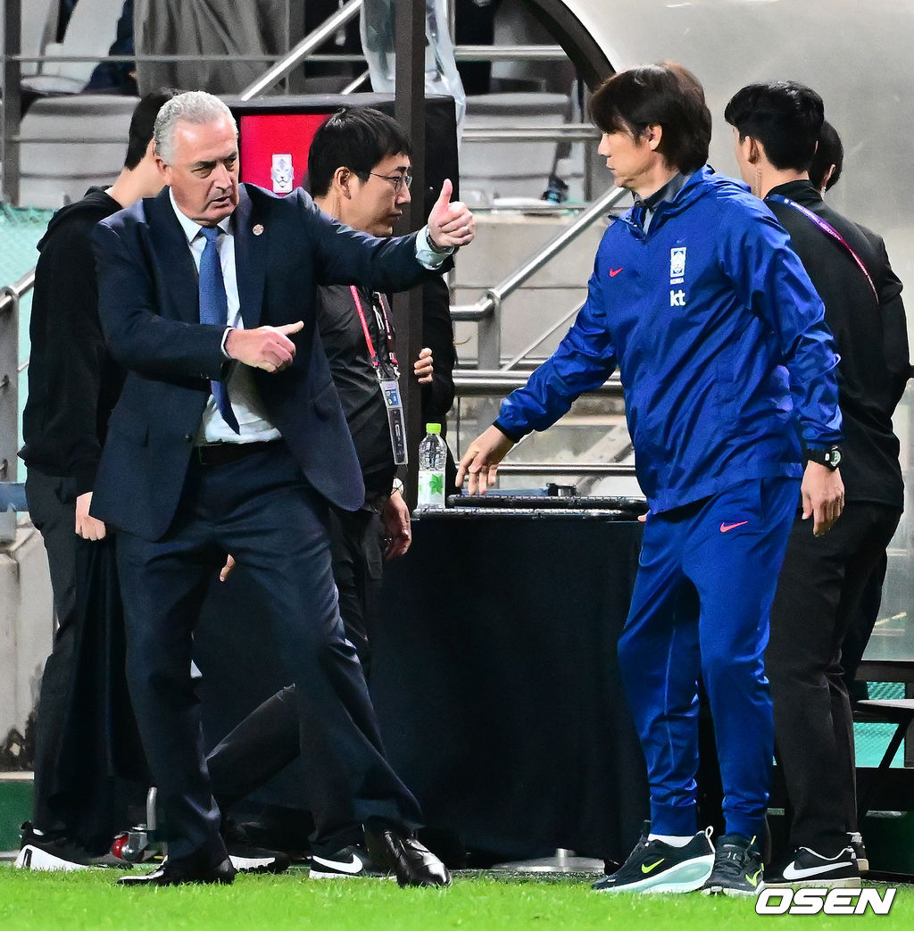 경기를 마치고 한국 홍명보 감독이 파라과이 알파로 감독과 인사를 나누고 있다. 2025.10.14. /jpnews@osen.co.kr