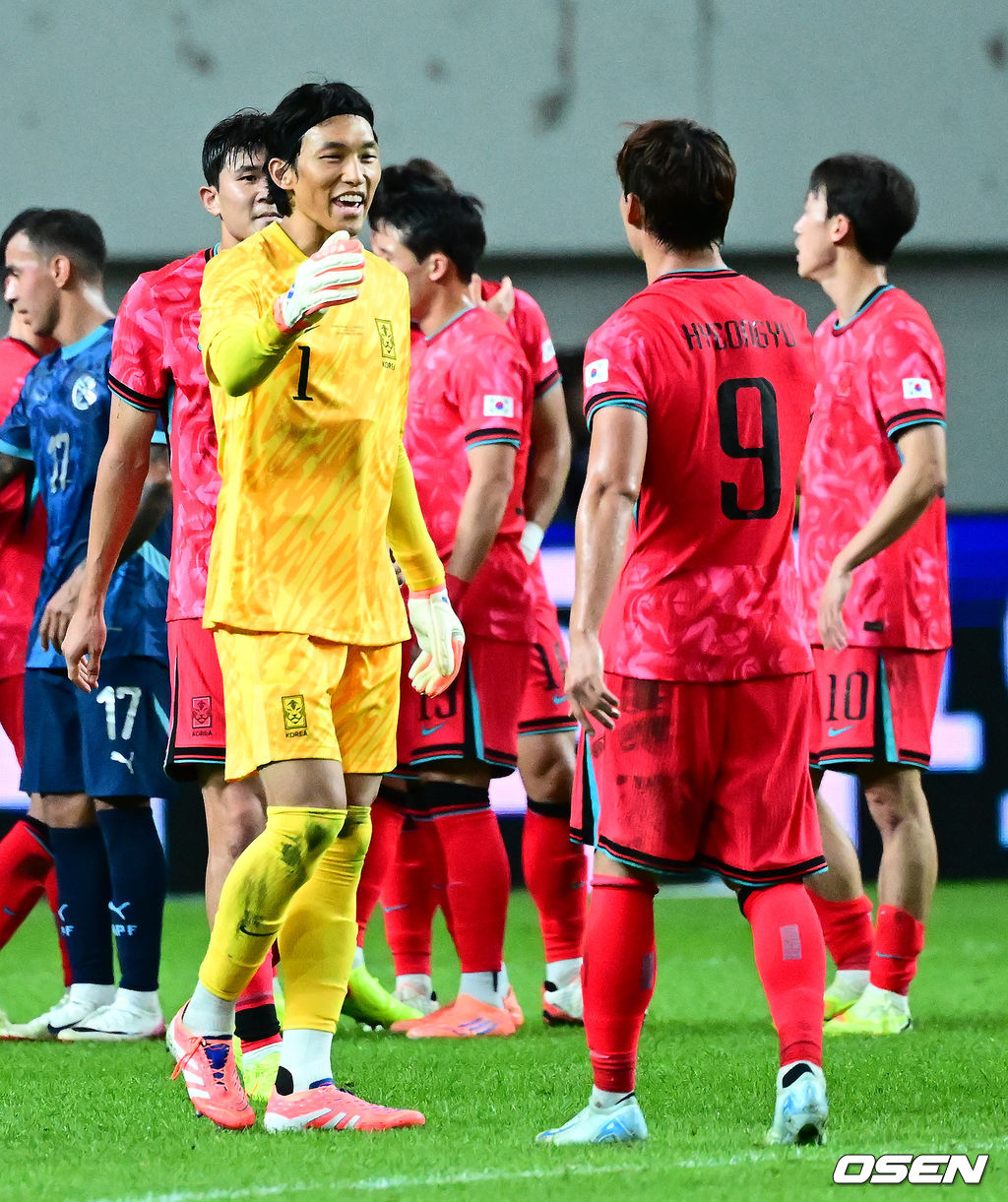 경기를 마치고 한국 김승규, 오현규가 승리를 기뻐하고 있다. 2025.10.14. /jpnews@osen.co.kr
