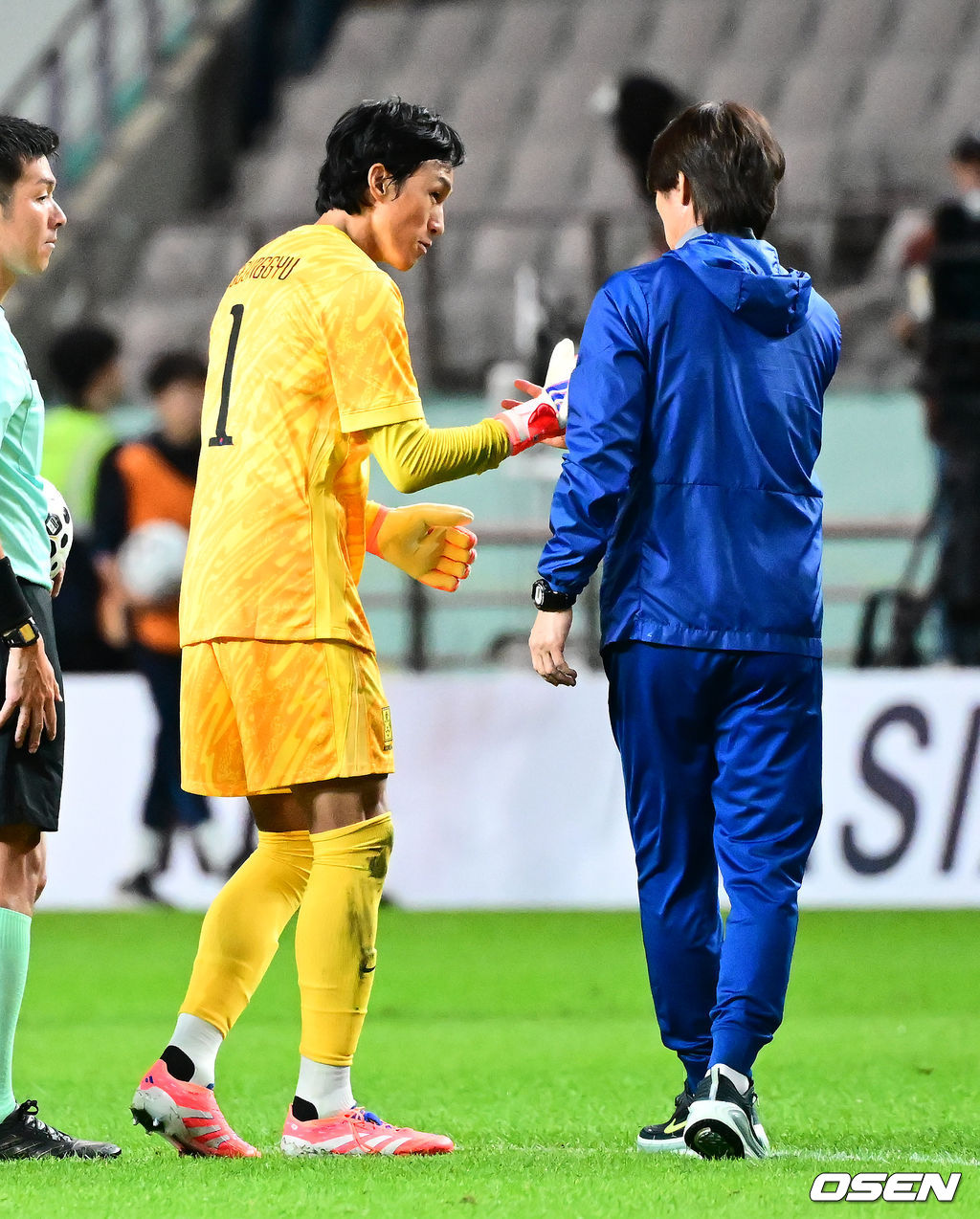 경기를 마치고 한국 홍명보 감독이 김승규와 승리를 기뻐하고 있다. 2025.10.14. /jpnews@osen.co.kr