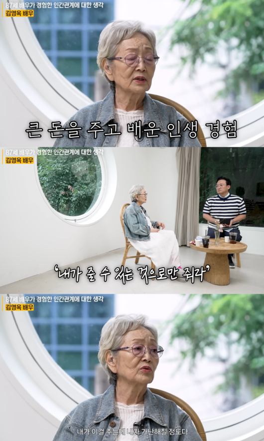 김영옥은 인간관계에 대해 “불편한 친구는 그냥 안보면 되지 그런 생각은 하지마. 젊어서부터 이렇게 살아 오는데 정신적으로 좀 문제가 있어서 이상하게 굴고 그러는 친구가 있다. 젊은이들도”이라며 “ 내가 그거를 배척하고 안보고 이래야지 그러지도 않고 살아왔지만 그건 지금까지도 이해시키고 싶지 그런 걸 다 자르고 그러고 사는 인생은 아니라고 본다. 이 나이 먹으면서 넓어진 영역이 아닌가 싶다”고 했다.