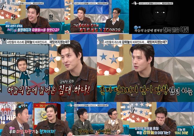 ‘라디오스타’에 ‘연예계 미담 랭킹 1위’ 배우 강하늘이 출연해 ‘오징어 게임’ 촬영 현장에서 칠흑 같은 어둠 속에 홀로 남겨졌던 사연을 공개한다.