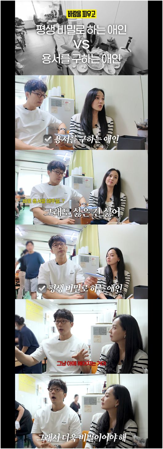 유진은 “난 쉽다. 바람 피우고 용서를 구하는 애인이 낫다. 평생 모를 수 있어도, 차라리 용서를 구하는 게 낫다. 싫다. 용서는 상황 봐서. 내가 정말 사랑하면 용서 한 번 해 줄 수 있지만 회복할 때 시간이 걸릴 거다”라고 말했다. 그러나 기태영은 “나는 바람을 피우면 모르는 게 낫다”라면서 "바람을 피울 거면 그냥 가라. 그런데 아이나 가족을 생각하는 거면, 차라리 평생 모르게 해라. 마음의 상처는 낫지 않는다"라며 깊은 몰입으로 흥분하는 모습을 보였다./osen_jin0310@osen.co.kr