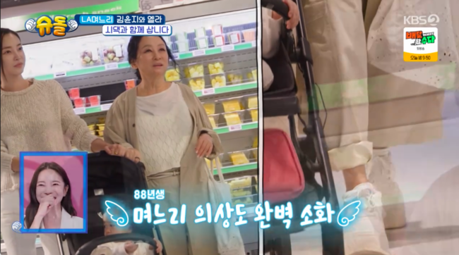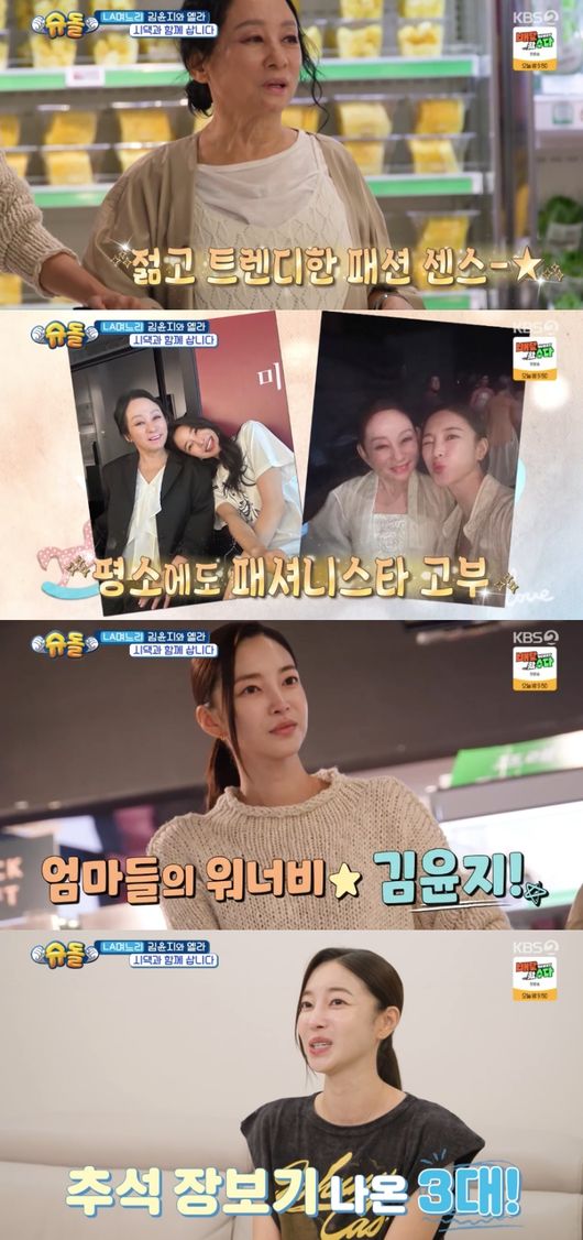 이날 김윤지는 시어머니 김영임, 딸 엘라와 함께 추석을 맞아 마트를 찾았다. 무엇보다 김영임은 72세가 믿기지 않는 트렌디한 패션을 선보여 눈길을 끌었다.