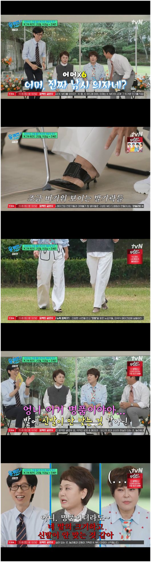 이어 조혜련은 “어머, 진짜 낚시 의자네?”라며 세트장에 대해 신기해했다. 유재석은 “발등에 벨트를 찼네?”라며 조혜련의 신발을 지적했다. 스퀘어 장식이 포인트인 명품 브랜드의 애나멜 뮬의 가격은 대략 200만 원 대로 알려져 있다. 그러나 이경실은 “안 그래도 저기서 걸어오는 샷을 찍는데 조혜련 발이 너무 꽉 껴 보이더라. 그런데 명품이래”라고 말해 유재석을 당황시켰다./osen_jin0310@osen.co.kr