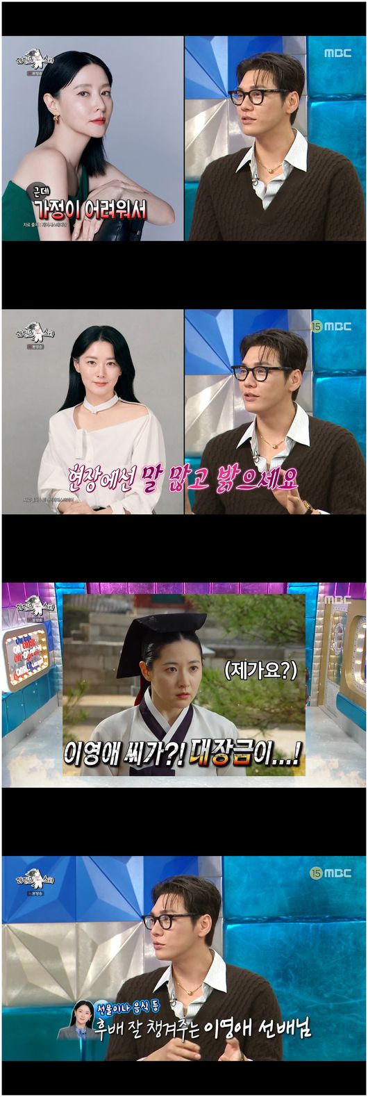 김구라는 “이영애도 말수가 없지 않냐”라며 현장 분위기를 물었다. 김영광은 “조곤조곤 말씀하시고, 현장에서 엄청나게 밝으시다. 선물도 많이 보내주신다”라고 말했다. 김구라는 “그러면 김영광은 그 곁에서 웃고만 있냐”라고 물었다. 김국진은 “이영애한테 예쁨 받는다며”라며 전해 들은 정보를 물었다. 김영광은 “옆에서 애교도 부리고 그런다”라고 말하다가 애교를 시키려는 분위기에 “살갑게, 그런다”라며 질겁했다.