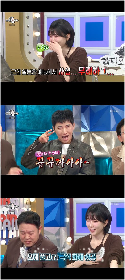 강지영은 “그후로 애교가 뭐길래 나를 힘들게 하나 싶어서 공부했다”라면서 “저도 이제 보여달라고 하면 ‘보여달라고 하면 보여줄 수 있어요’ 정도는 한다”라며 어설프지만 최선을 다하는 모습을 보였다. 김구라는 “일본에서는 애교를 안 시키냐”라는 질문을 했고 강지영은 “일본은 사실 무례한 걸 안 시키는”, “죄송해요”라고 말해 김구라의 질문이 속된 말로 '물고 늘어진다'는 것을 시청자로 하여금 간접적으로 느끼게 했으나, 이내 웃음으로 승화하는 모습을 보였다./osen_jin0310@osen.co.kr
