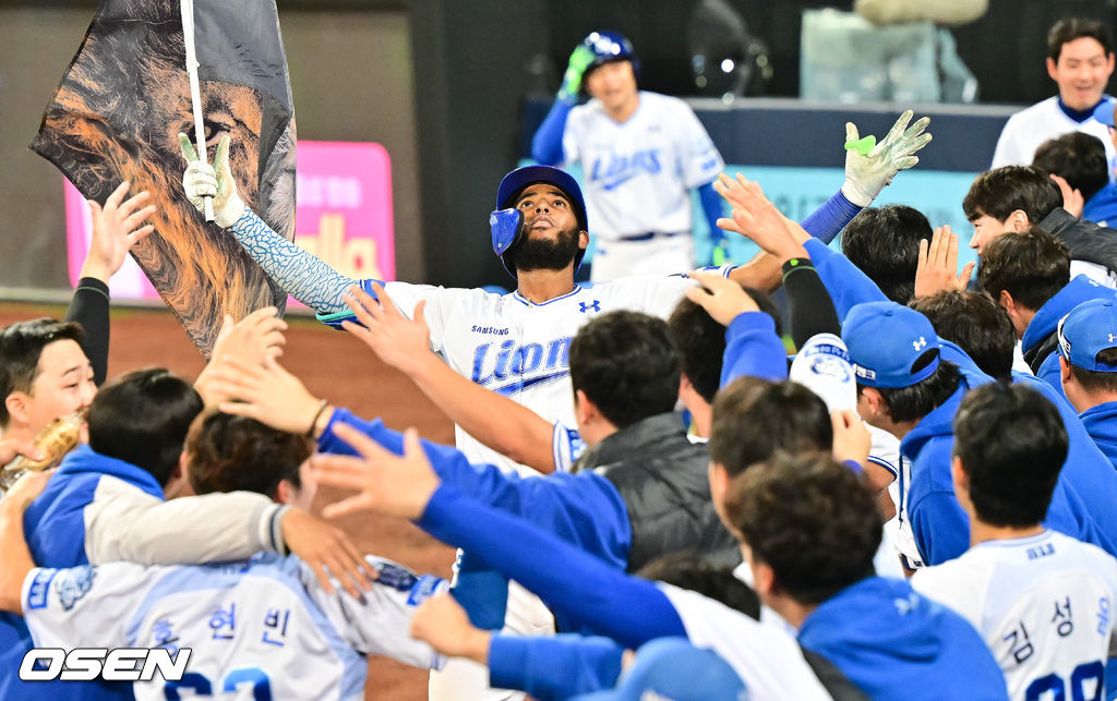 8회말 2사 1루 삼성 디아즈가 결승 2점 홈런을 날리고 동료들의 축하를 받고 있다 2025.10.14 / soul1014@osen.co.kr