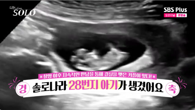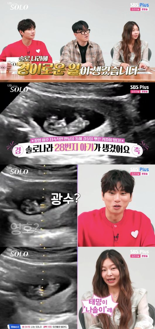 이때 MC들 앞에 공개된 것은 태아 초음파 영상. 제작진은 자막을 통해 ‘촬영 이후 지속적인 만남을 통해 결실을 맺은 커플이 있다! 경축 솔로나라 28번지 아기가 생겼어요’라고 설명했다. ‘나는 솔로’를 통해 인연을 맺어 태명은 ‘나솔’이라고 지었다고.
