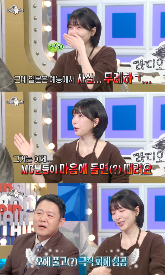 이후 일본에서 배우로서 입지를 굳힌 강지영의 필모그래피를 듣던 김구라는 “일본에서는 애교를 안 시키냐”라며 냉큼 물었다.이에 강지영은 “일본은 사실 무례한 걸 안 시키는”, “죄송해요”라며 저도 모르게 말하다 입을 막았다. 김구라는 “우리 푼 거 아니냐”라면서 “무례한 거 원조는 일본인데”라며 퍽 서운해했고, 강지영은 “일본 예능은 MC들이 아끼면 때린다”라고 말해 김구라를 억울하게 했다.