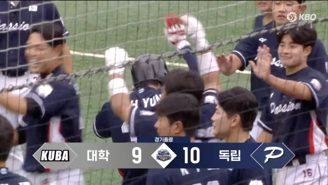 그럼에도 대학 선발팀은 기회를 이어갔다. 폭투와 박도현의 볼넷, 김다운의 헤드샷 사구로 2사 만루 기회가 이어졌다. 독립리그 올스타 투수 지윤은 헤드샷 퇴장을 당했다. 결국 2사 만루에서 윤승민의 우전 적시타로 9-9 동점에 성공했다. 2루 주자가 홈에서 잡히며 역전까지 이어지지 못하고 이닝이 종료됐다. 윤승민은 4안타 4타점 맹활약을 펼쳤다.