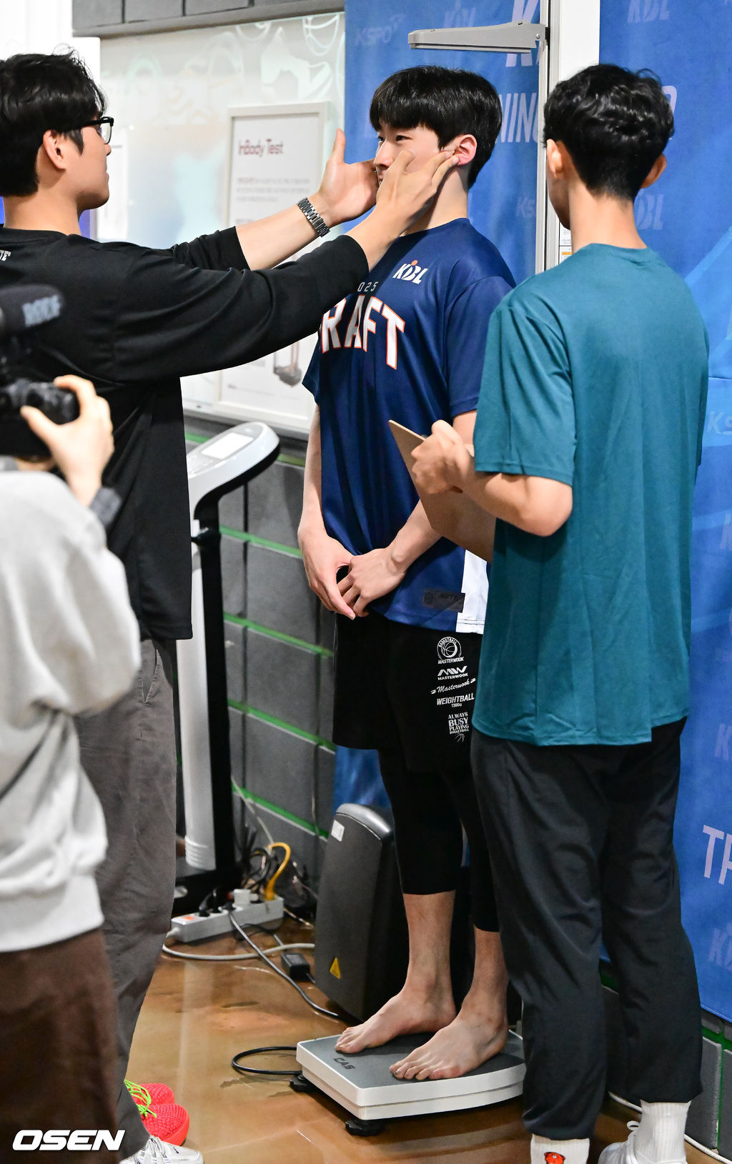 고려대 문유현이 테스트 앞서 키를 미리 재고 있다. 2025.10.16 / soul1014@osen.co.kr