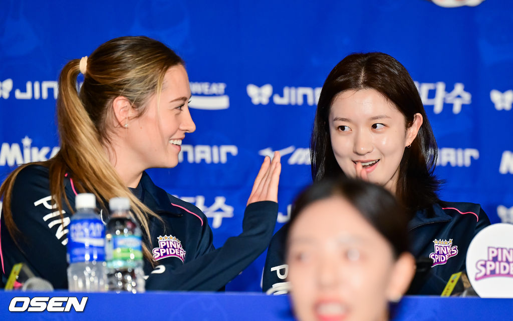 흥국생명 레베카 라셈와 이다현이 하이파이브를 하고 있다 . 2025.10.16 / soul1014@osen.co.kr