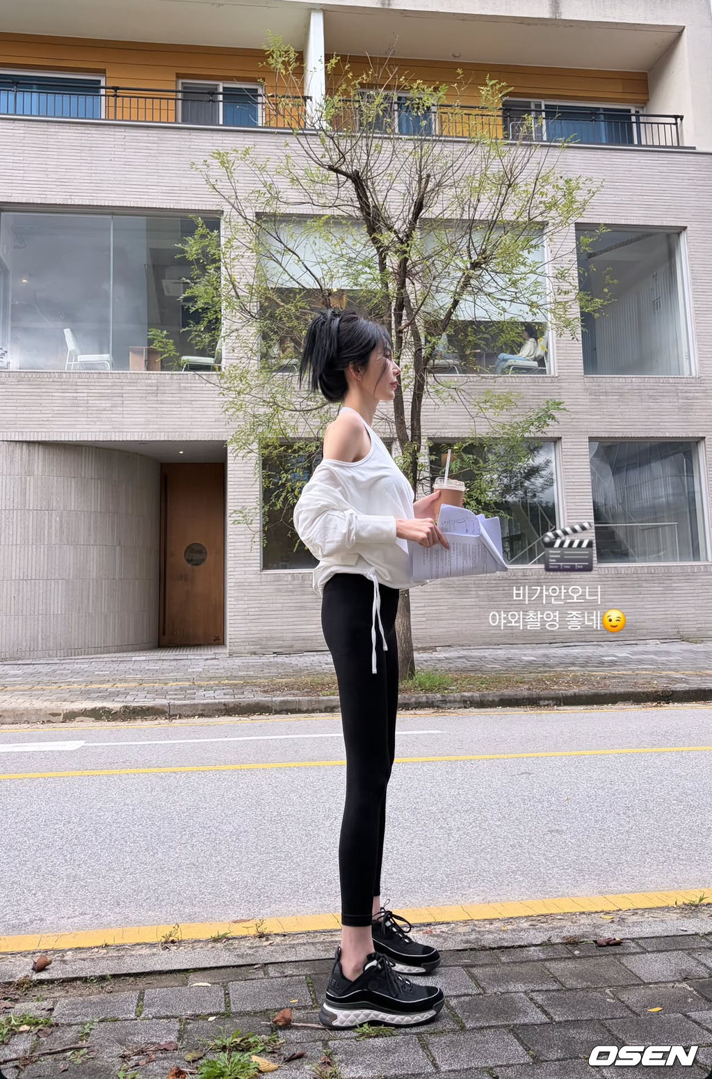 배우 신주아가 촬영 중에도 늘씬한 각선미를 뽐냈다.