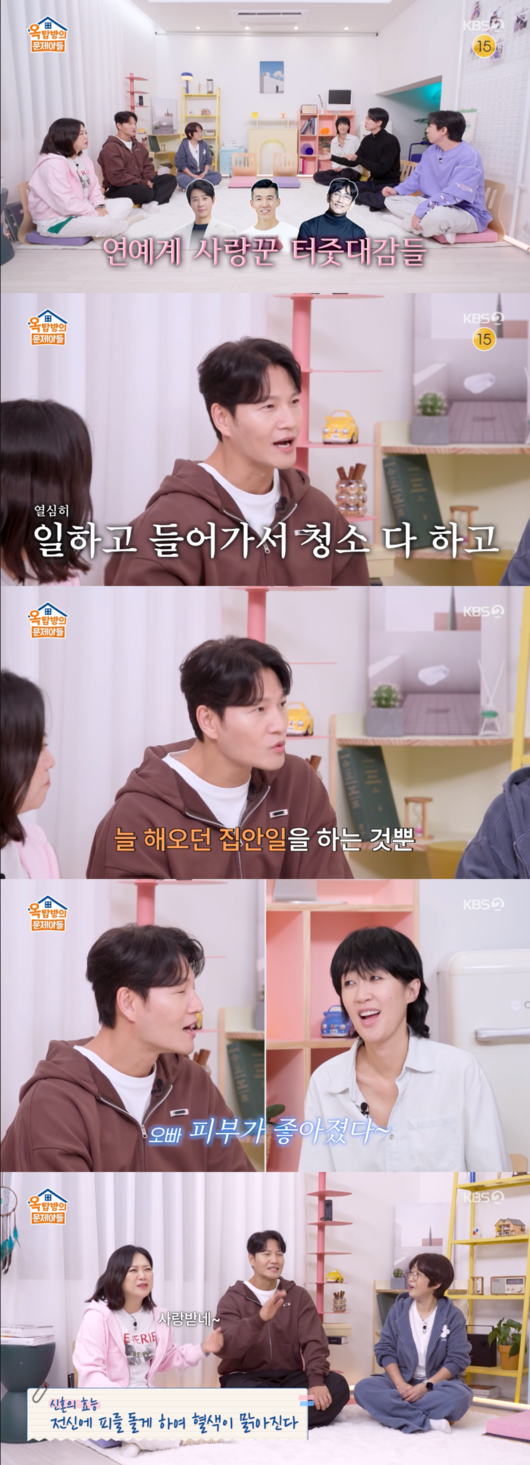 사랑꾼 계보를 이야기하던 중 김종국은 “아침부터 열심히 일하고 들어가서 청소 다 하고 분리수거 다 하고” 산다고 밝혔다. 그는 “왜냐하면 내가 혼자 살았잖아 쭉”이라며 원래 하던 일을 계속하는 것일 뿐이라고 겸손하게 말했다. 이에 홍진경은 “오빠 피부가 좋아졌다”고, 김숙은 "사랑받네"라고 장난스럽게 말해 웃음을 자아냈다.
