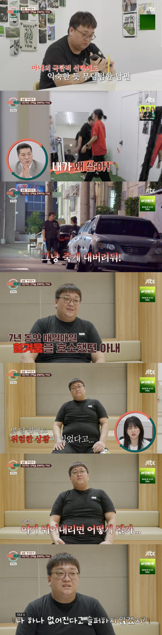 더욱 충격적인 것은 아내가 7년 동안 매일매일 죽겠다는 말을 달고 살았다는 사실이다. 아내는 부정적인 생각과 극단적 행동을 반복했으며, “옥상에 올라갔었어요”라며 최근에도 극단적인 생각을 했음을 고백했다.