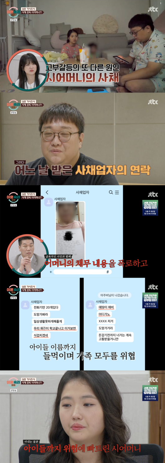 더욱 심각한 것은 시어머니가 최근까지도 소액의 사채를 반복적으로 쓰고 있다는 점이다. 이로 인해 사채업자는 온 가족이 있는 단체 채팅방에 어머니의 굴욕적인 사진과 채무 내용을 공개했다.