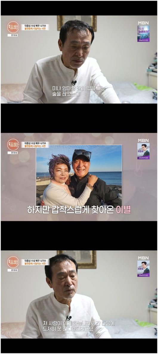 ‘특종세상’ 배우 나기수가 아내 장무식 씨를 잃고 실의에 빠진 모습을 보였다.