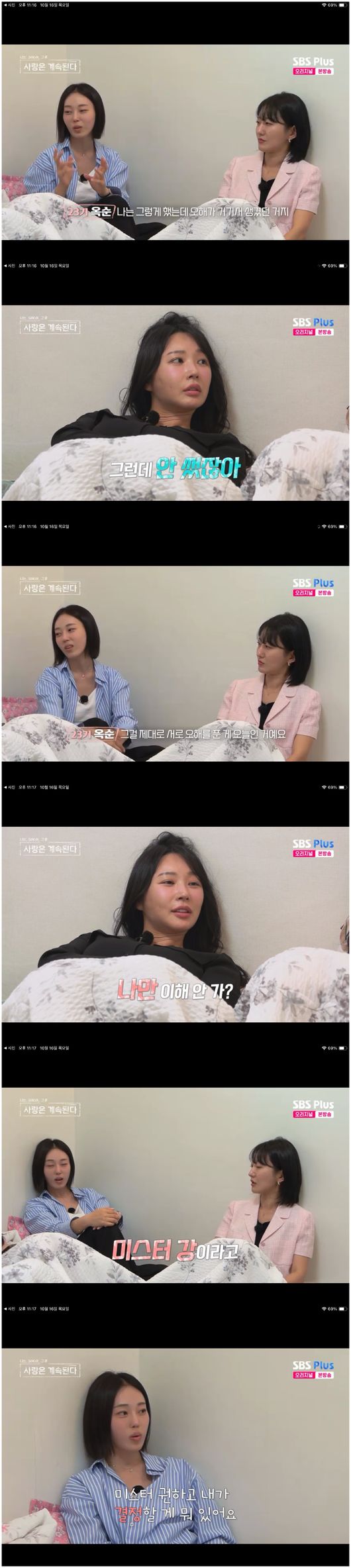 결국 23기 옥순은 말을 꺼냈다. 23기 옥순은 “23기 순자랑 11기 영숙은 내가 선택할 때마다 나에게 누구 선택할 거냐고 자꾸 묻지 않았냐”라며, 미스터 한에 대한 결정과 미스터 권에 대한 결정이 왜 자기에게 따라 달렸는지를 물었다. 23기 순자는 “언니만 정리하면 다 돼”, 11기 영숙은 “남자들한테도 23기 옥순은 정리되지 않은 게 많았다”라고 말했다. 11기 영숙은 “나는 애매한 사람 붙잡고 직진하는 사람이 아니다. 그러니까 오히려 여자들끼리 가까우니까 먼저 듣고 정리를 하려고 한 거다”라고 말했다.