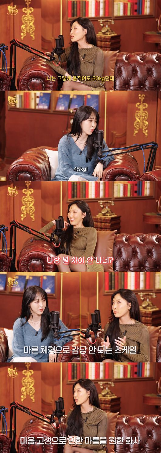 화사는 "나는 그렇게 움직여도 50kg이던데"라고 웃으며 말했고, 문별은 "라인이 다르지 않냐"고 반박했다. 이어 몸무게를 묻자 문별은 "지금 45kg"이라고 답했고, 화사는 "나랑 별 차이 안 나네?"라며 만족스러워 했다.