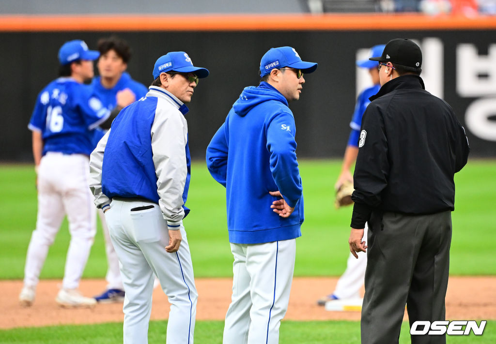 5회말 1사 1루에서 삼성 류지혁이 한화 김태연의 3루땅볼에 하주석을 포스아웃시키고 1루 송구하는 과정에서 넘어졌다; 박진만 감독이 그라운드에 나와 한화 하주석과 충돌 과정에 대해 확인하고 있다. 2025.10.18 /jpnews@osen.co.kr