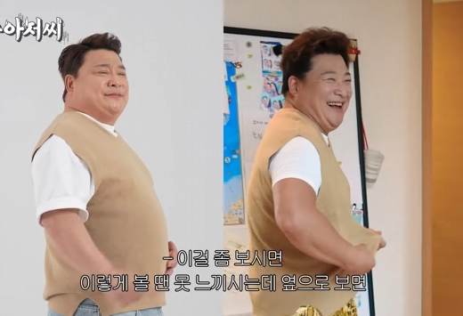 PD는 "집 분위기가 다른 이유가 있었다. 깔끔해진 느낌"이라고 말했고, 윤정수는 "나초가 뭐냐. 적당히 먹어야지. 확실히 나초가 살찐다. 오랜만에 등산모임에 잠깐 갔다왔다. 사람들이 살빠졌다고 얘기도 하지만 헉헉대는게 없어졌다더라"라며 "그리고 제가 하나 보여드릴게 있다. 이 옷 기억나냐. 그때 입었던 옷이다. 옆으로 보면 배가 막 이랬지 않냐. 근데 지금은 없다. 옷이 많이 남는다"라고 다이어트 전 입었던 옷을 다시 꺼내입어 확연히 달라진 핏을 강조했다.