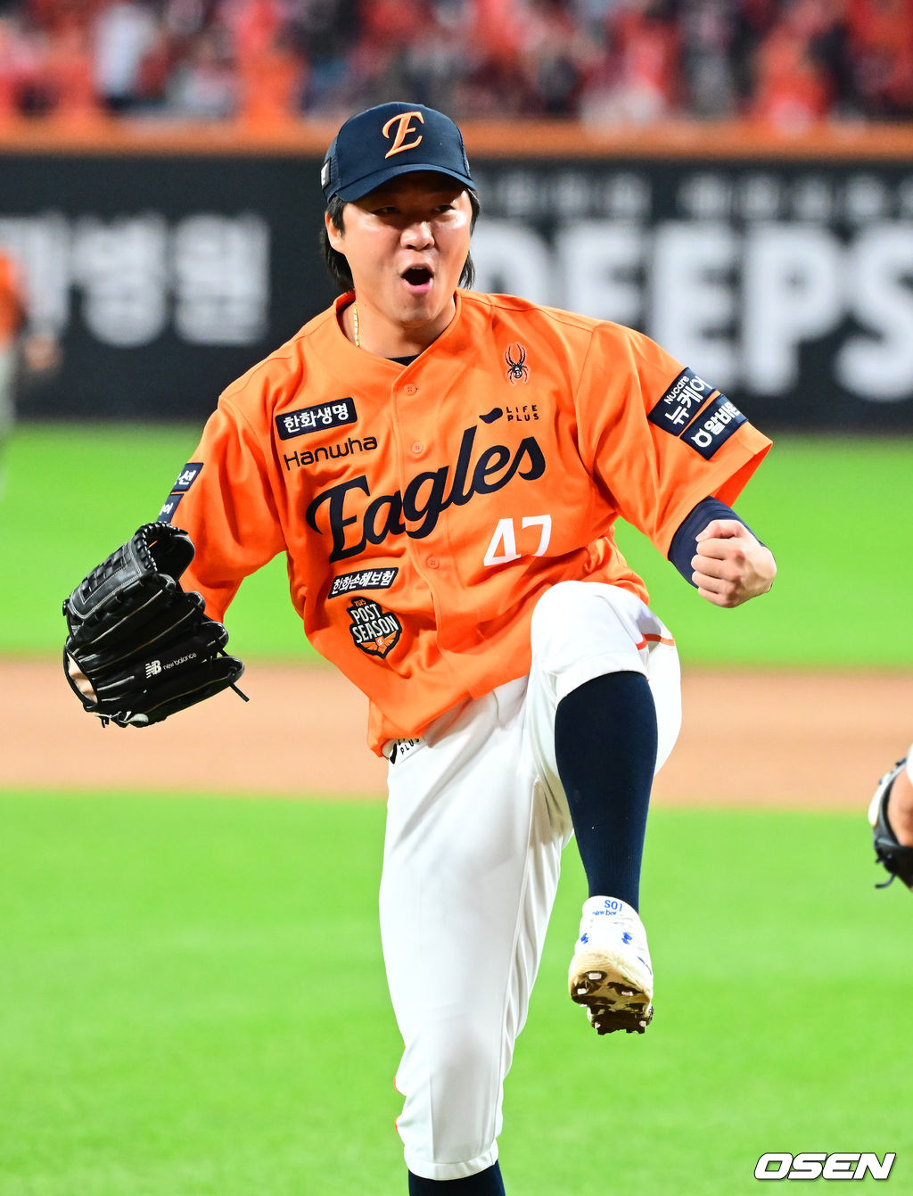 경기를 마치고 한화 김범수가 승리를 기뻐하고 있다. 2025.10.18 /jpnews@osen.co.kr