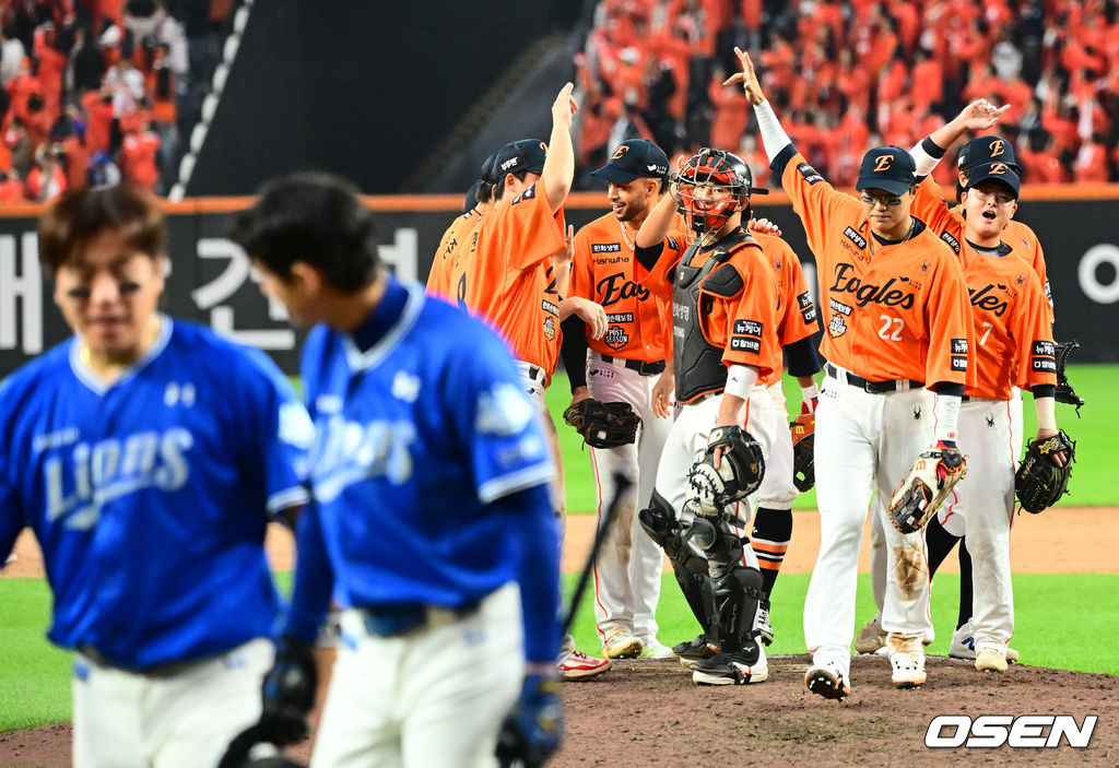 경기를 마치고 한화 선수들이 승리를 기뻐하고 있다. 2025.10.18 /jpnews@osen.co.kr