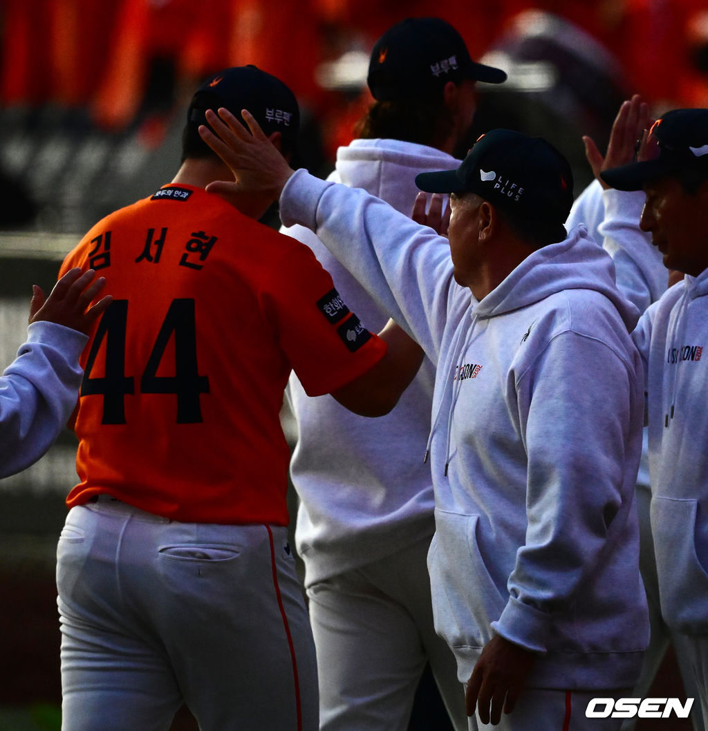 경기를 마치고 한화 김경문 감독이 김서현을 격려하고 있다. 2025.10.18 /jpnews@osen.co.kr