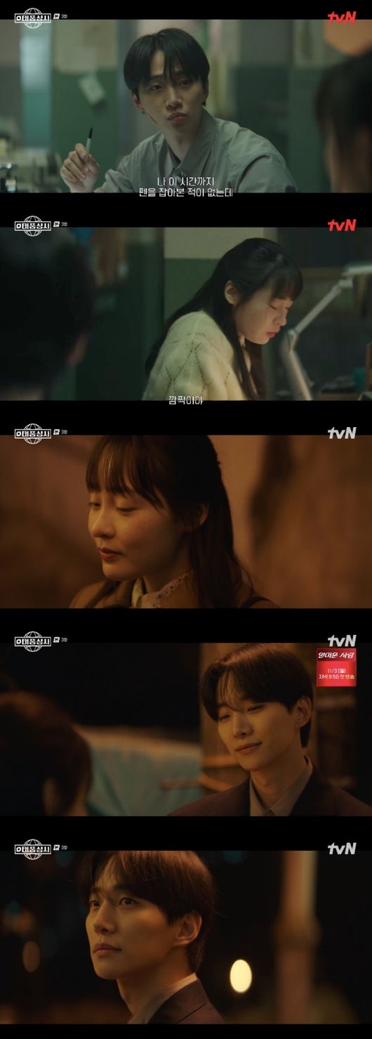 야근을 하던 강태풍과 오미선. 강태풍은 “11시네. 이 시간까지 펜을 잡아본 적이 없는데. 대단하지 않냐”라고 말했고, 오미선은 “막차”라며 깜짝 놀랐다.