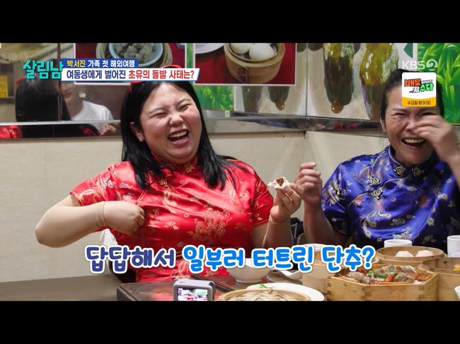 박효정은 이날도 유쾌했다. 박서진의 제안으로 어머니와 함께 치파오를 빌려 입은 박효정은 꼭 끼는 옷에도 오히려 웃음을 자아냈다. 박서진은 “엄마랑 효정이의 옷을 위해 뒤졌다. 4XL 사이즈는 구석을 뒤져서 나왔다”라고 말했다. 박서진은 “전 저걸 보고 무슨 생각을 했냐면, 치파오는 원래 예쁘지 않냐. 그런데 둘이 입은 걸 보니 마트료시카 같은 것 같더라”라며 사랑하는 동생과 어머니이지만, 저만의 냉철한 판단을 내렸다.