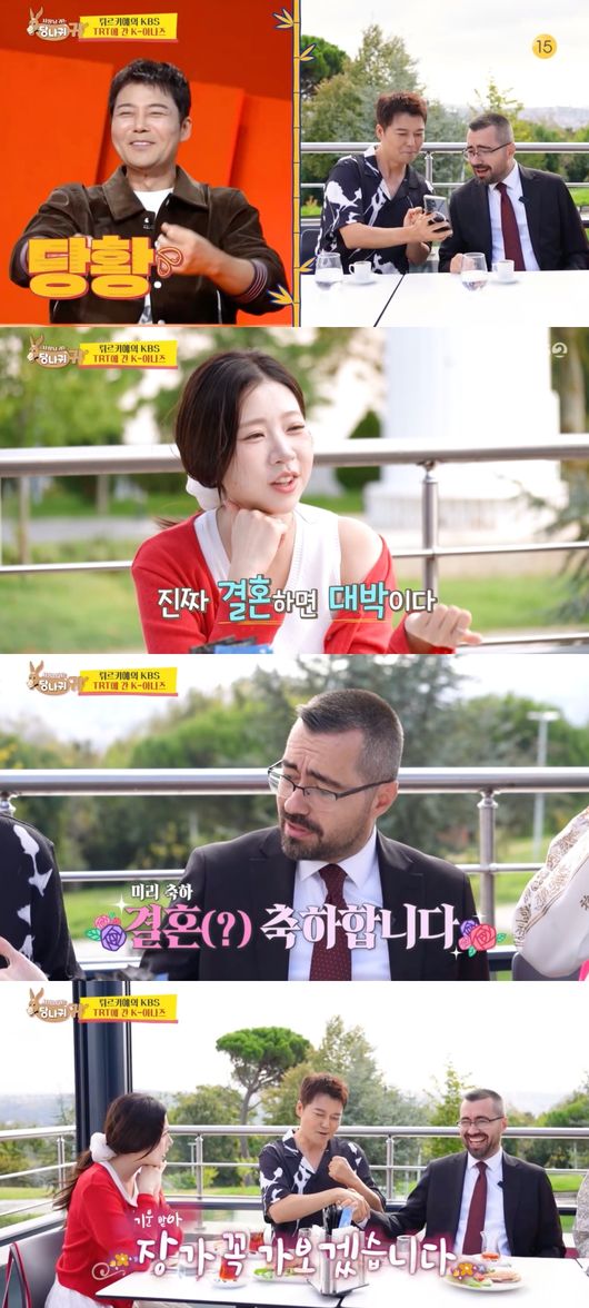 엄지인은 "거 봐라. 내가 귀인이다"라고 말했고, "진짜 결혼하면 대박이다"라며 기대감을 높였다. 튀르키예 측 또한 "결혼 축하한다"라며 거들자, 전현무는 "기운을 받아서 장가를 꼭 가보겠다"라고 화답했다.