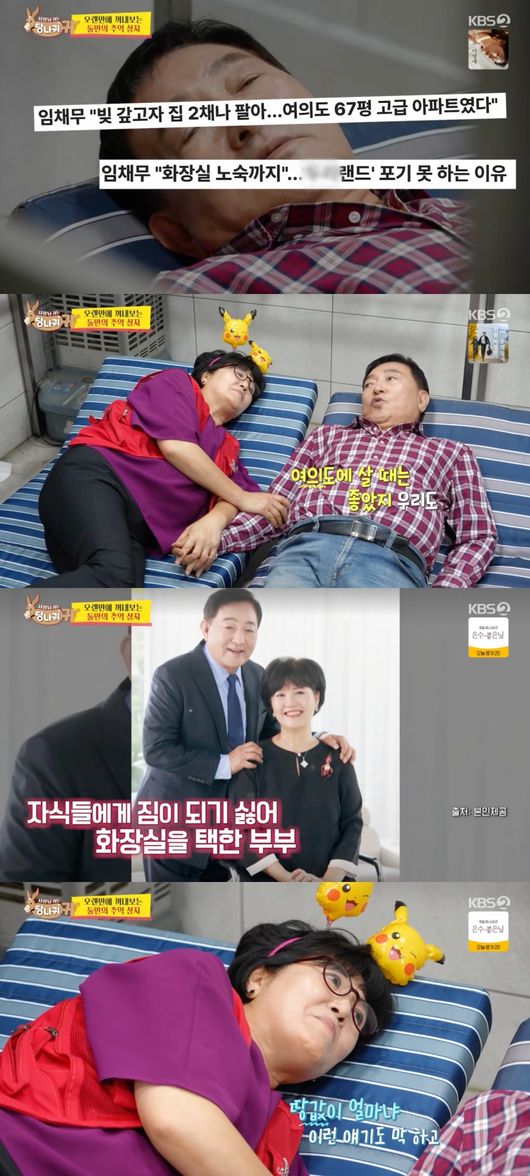 임채무는 두리랜드를 둘러보던 중 이제는 쓰지 않는 화장실 구석에 놓인 간이 침대 2개를 바라보며 아내를 불렀다. 알고 보니 임채무 부부가 어려운 시절 노숙하던 화장실이었다.