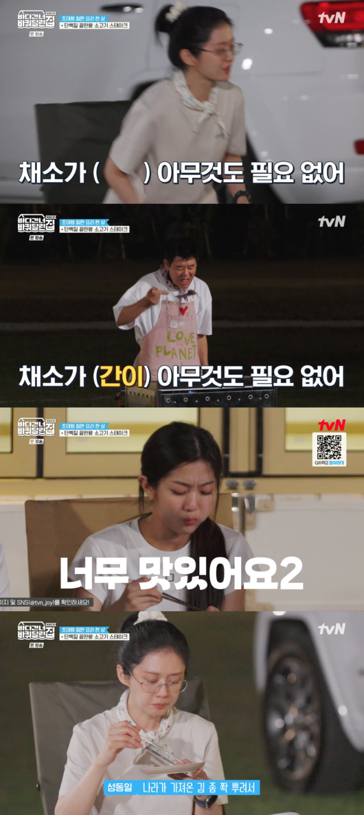 마침내 스테이크를 맛본 장나라는 고개를 끄덕이며 "채소가 아무것도 필요 없어"라며 간이 완벽하게 맞는다며 감탄했다. 완벽하게 구워진 성동일표 스테이크에 대한 장나라의 솔직한 극찬은 모두의 공감을 샀다.