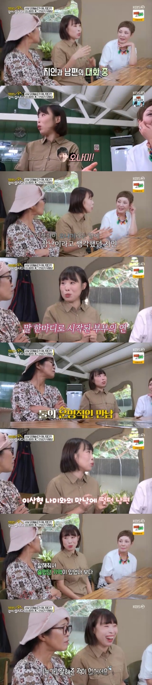 황석정은 "누군가 잘해줘서 슬펐던 기억이 있었나보다"라고 짐작했고, 오나미는 "잘해 준 적이 없었다"며 "내가 남편보다 2살 누나다. 연애 할때도 자주 못 만나면 남편이 집 앞에 꽃 한송이와 편지를 주고 갔다. '오늘도 고생 많았어요'라는 메시지를 써줬다. 그런 섬세함이 감사했다"며 당시를 회상했다.