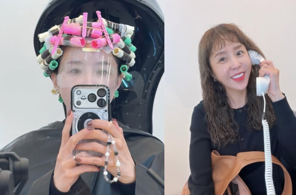 공개된 사진 속 신지는 미용실에서 파마 중인 모습이다. 휴대폰으로 인증 사진을 남기며 기대 중인 모습.