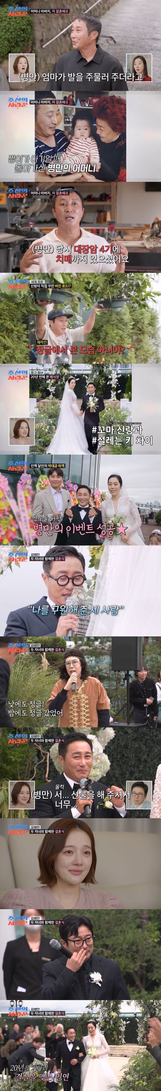 김병만은 "우리 아내를 잘 키워주셔서 감사하다. 이런 선물을 주셔서…"라고 운을 뗐지만, 솟구치는 여러 감정에 말을 잇지 못했다. 하객들도 눈시울을 붉힌 가운데, 지켜보던 사랑꾼 MC들도 눈물을 흘렸다. 마지막으로 김병만의 아내는 자신의 부모님께 "나의 보석을 지키기 위해 제가 선택한 것과, 힘든 시간 기다리며 같이 아이를 봐주신 부모님…나도 귀한 딸인데…너무 감사하고 고맙습니다"라고 인사를 올려 감동을 자아냈다. 이수근도 "병만이가 웃는 일이 별로 없었다. 드디어 진정한 행복을 찾은 모습에 기분이 좋다"라며 미소 지었다. /kangsj@osen.co.kr