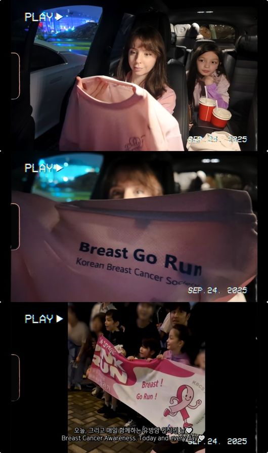 이어 “아쉽게도 10월의 ‘핑크런’은 신청이 늦었어요. 내년에 꼭 함께 할 수 있길 바라요”라며, "이 모임은 정말 에너지가 넘치고 밝아요. 아이들도 같이 잘 뛰었답니다”라고 덧붙였다. 안나는 유방암 인식 및 극복을 위한 달리기 행사 ‘Breast Go Run’이 적힌 티셔츠를 맞춰 입고 가족들과 함께 달렸다.