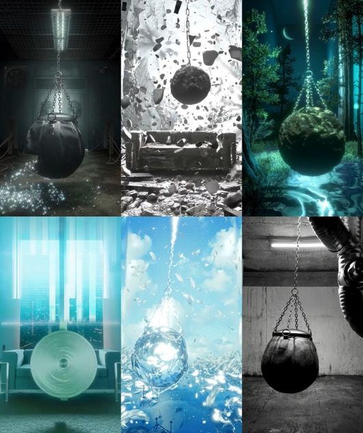 고조되는 음악에 맞춰 샌드백이 좌우로 흔들리며 신비로운 분위기를 자아내고, 깜빡이는 조명과 흔들리는 문은 긴장감을 더한다. 떨어진 깃털이 모여 날개를 이루는 장면, 조명에 따라 일렁이는 물결이 하나의 파동처럼 연결되는 순간 등 상징적인 이미지가 쌓여 보는 이의 몰입감을 높였다.