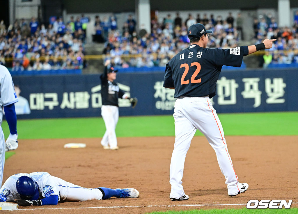3회말 무사 1루 상황 삼성 류지혁의 우익수 플라이 때 1루 주자 강민호가 한화 우익수 최인호의 송구에 포스아웃 됐다. 기뻐하는 한화 1루수 채은성과 아쉬워하는 주자 강민호. 2025.10.21 / dreamer@osen.co.kr