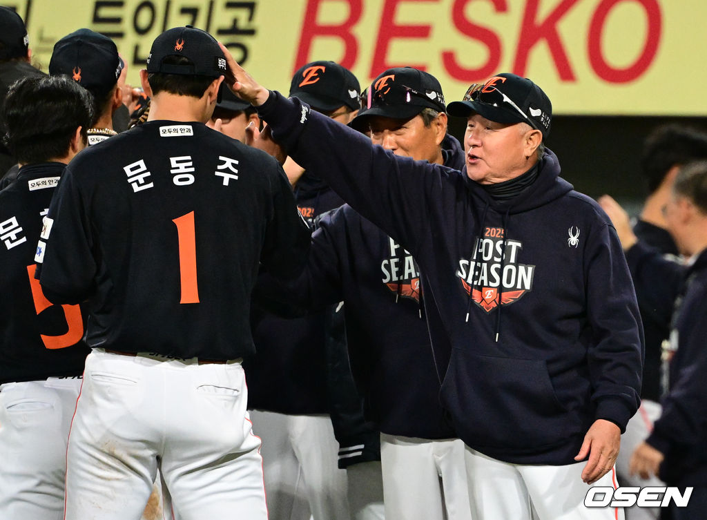 한화 김경문 감독이 문동주와 승리를 기뻐하고 있다. 2025.10.21 /cej@osen.co.kr
