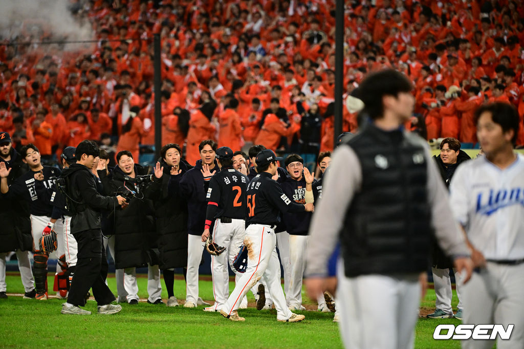 한화가 승리를 기뻐하고 있다. 2025.10.21 /cej@osen.co.kr
