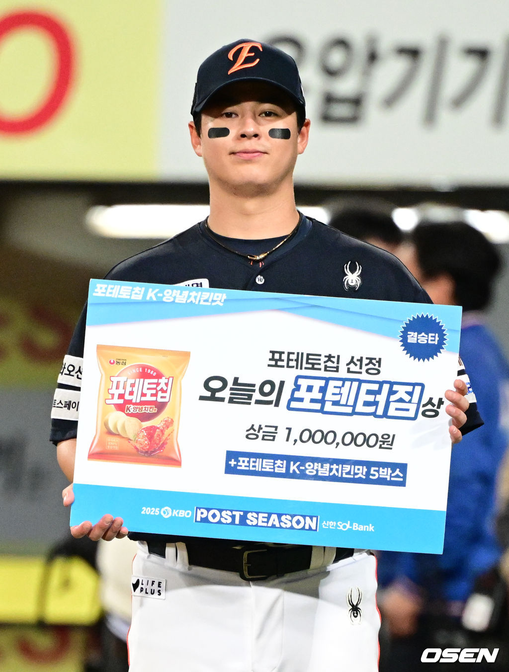 플레이오프 오늘의 포텐터짐상을 차지한 한화 문동주가 포즈를 취하고 있다. 2025.10.21 /cej@osen.co.kr