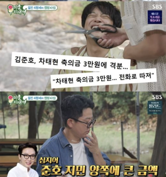 이는 김준호·김지민 부부도 마찬가지. 결혼식에서도 ‘축의금 서열’이 화제가 됐다. 아예 유튜브 채널을 통해 이를 공개한 두 사람. 김지민은 “1등은 비연예인 친구였다”며 “정이랑 언니가 우리 집 드레스룸을 직접 짜줬다. 거의 1000만 원어치였다”고 밝혔다. 김준호도 “맞다. 진짜 통 크게 했다”고 덧붙여 화제고 됐다.