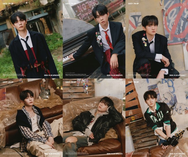 공개된 사진 속 루시는 무너진 건물과 잔해가 흩어져 있는 디스토피아적 배경을 뒤로, 붉은 체크무늬와 디스트로이드 디테일이 돋보이는 히피 스타일 슈트를 입은 채 모습을 드러냈다. 세 멤버는 절제된 표정과 차분한 시선으로 정면을 응시하며, 붕괴된 공간과 대비되는 독특한 분위기를 연출해 보는 이의 시선을 사로잡았다.